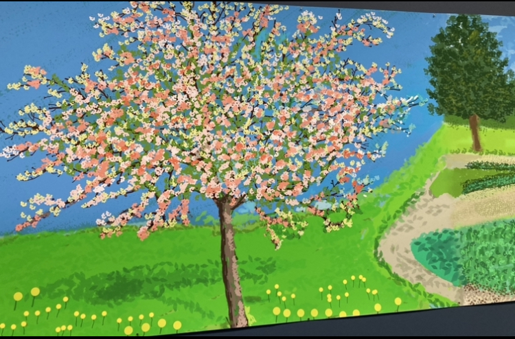 Am împrumutat o imagine primăvăratică „furată” de mine de la expoziția lui David Hockney: un fragment din imensa frescă pictată pe iPad „A Year in Normandie” și prezentată a l’Orangerie de Paris anul acesta.